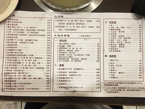 店裡是單人單鍋的用餐方式,兩人共鍋會收80元的低消,但可以抵單點品項的消費,還挺合理的。鍋品的種類多到難以想像,一般小火鍋店的鍋類大約十多種就不算少了,米澤足足有30種鍋類可選擇,除了牛羊豬雞這種常見的以外,海鮮鍋、豆漿鍋、魚片鍋、麻辣鍋、菌菇鍋還有雙漿都非常有特色。