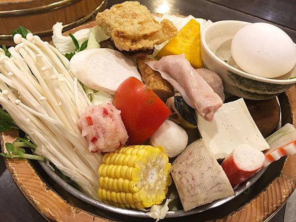第一次到米澤用餐,菜盤上桌時妹子就驚呼了一聲,真的很澎湃啦!照片裡看到的其實是一個不小的木盆,上方放滿了火鍋料,其實下方鋪滿了青菜高麗菜、豆苗都很大方的一大把,光是看起來就很開心。