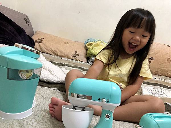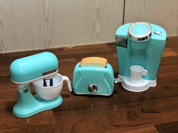 這個組合包括了烤麵包機、攪拌器以及咖啡機,各自還有一些配件,做工相當精緻,不用擔心孩子在遊戲過程中受傷,這是家長最重視的細節。