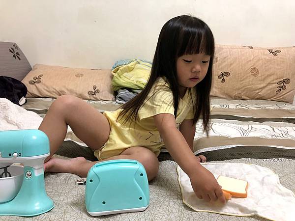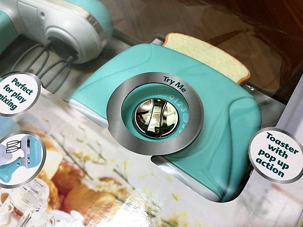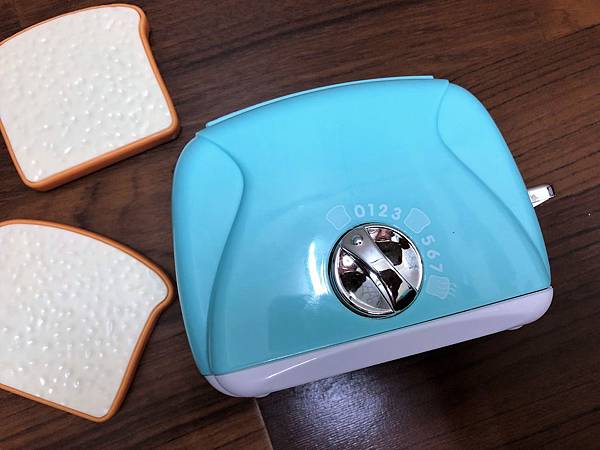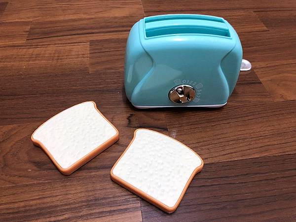 這是三件組裡面最簡單的一項,可以指導小朋友了解麵包機的操作,只需要放入白吐司,壓下把手後扭轉至需要的刻度,麵包機就會自動運作,而且會有很逼真的聲音喔,刻度跑完後會像真的麵包機一樣跳起。