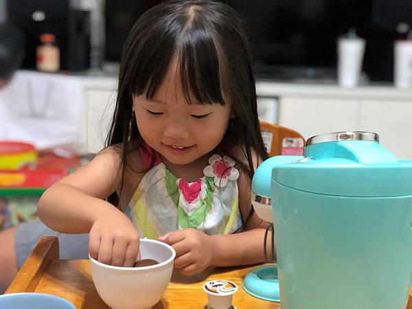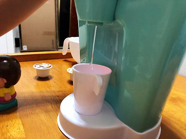 這款是其中最好玩耐玩,也是最複雜的一款。如果家長會陪伴一起玩,或是小朋友比較大了,建議一定要搭配清水一起使用,因為是仿真咖啡機啊,所以可以注入清水,模擬咖啡沖泡完成後流入咖啡杯中,而且還有聲光效果呢!