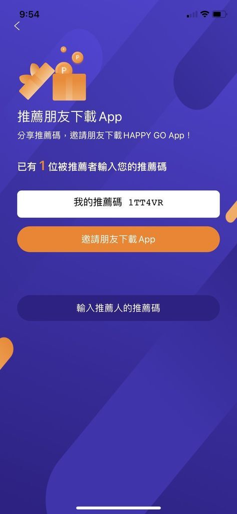 在我的帳號內有許多額外操作,像是「推薦碼」的部份,可以分享推薦碼給好友,讓好友一起輕鬆使用HAPPY GO App,也可以輸入其他人的推薦碼,在這個頁面可以看到有多少人使用你的推薦碼。