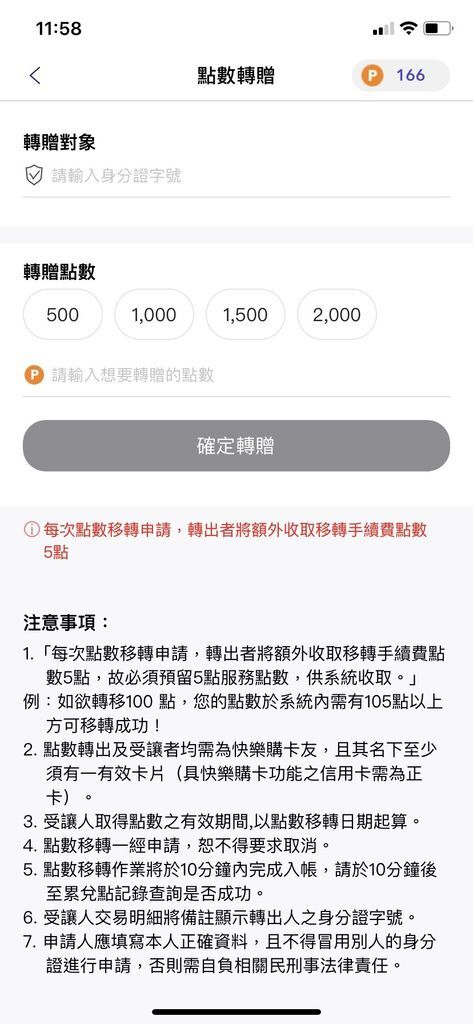 「點數轉贈」可將自己的點數贈送給其他HAPPY GO卡友,但是每次轉贈會收取5點服務費用,所以要衡量清楚再動手,無法取消的喔。