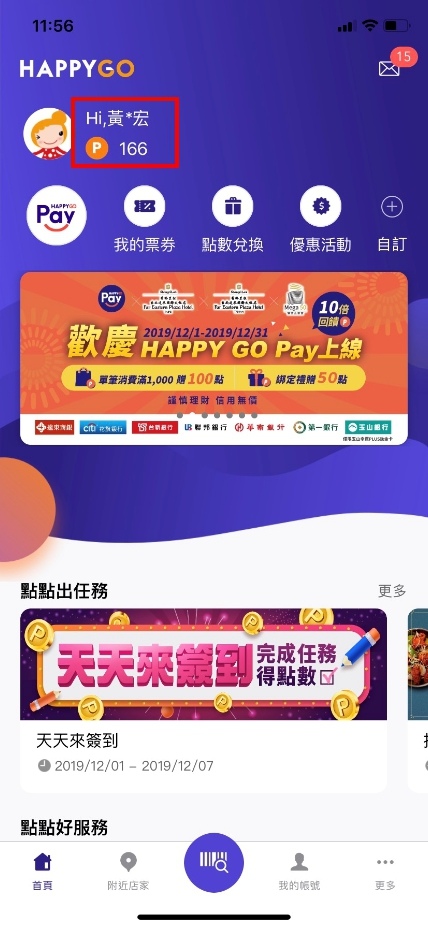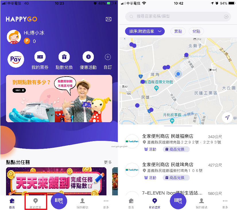 想要累積點數,卻懶得查詢合作店家資訊?沒關係,只要打開App,點選下方的「附近店家」,選擇上方的「累點」,就能清楚看到附近能累積點數的地方囉!