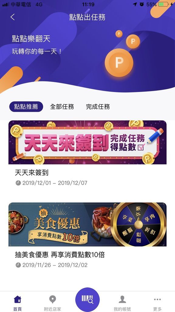 玩遊戲賺點數,這款App可不只是累點與兌點喔,根據實測日12/1看來有兩個任務可以玩,分別是天天來簽到及抽抽美食優惠,真是在家躺著也能賺點數!