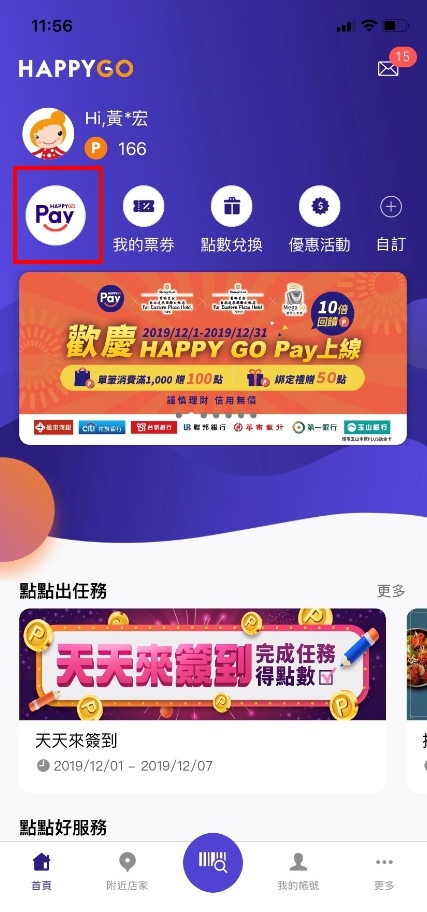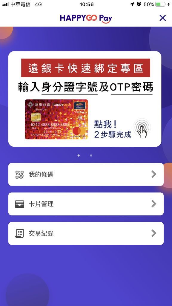 在首頁點選進入「HAPPY GO Pay」,第一次操作時需要建立信用卡資料。