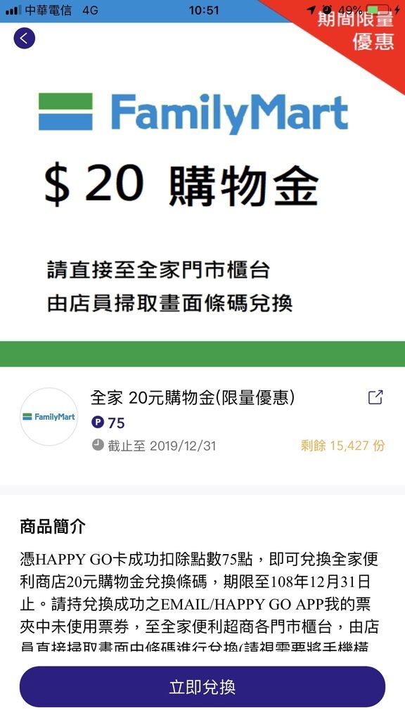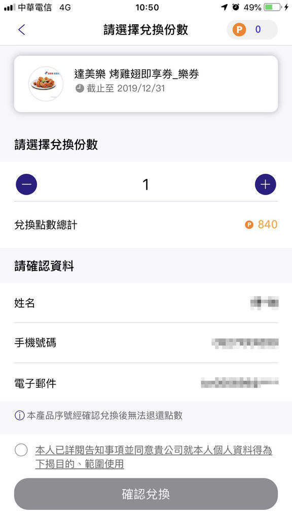 點選兌換後,會出現該品項的說明,有些品項兌換需要填寫基本資料用以核對,有些只需要出示條碼即可,要注意這些兌換項目,因為都是直接用手機App操作,所以不接受手寫或口述等兌換方式。