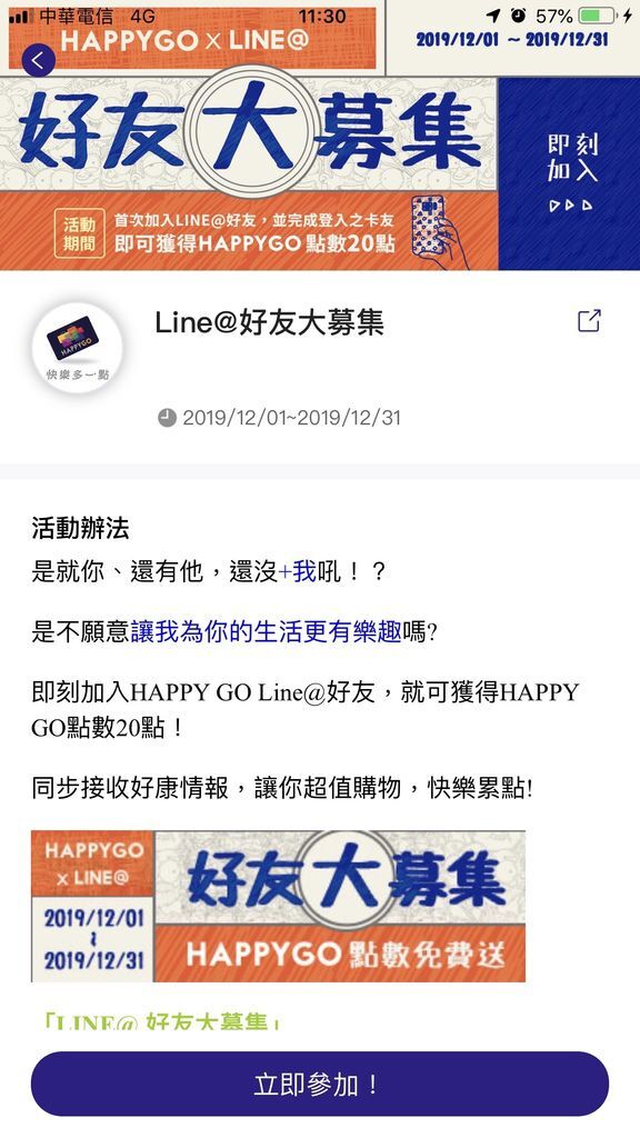 LINE@好友大募集,活動期間加入HAPPY GO Line@好友,就能獲得20點數,這個太好賺,要馬上賺起來!