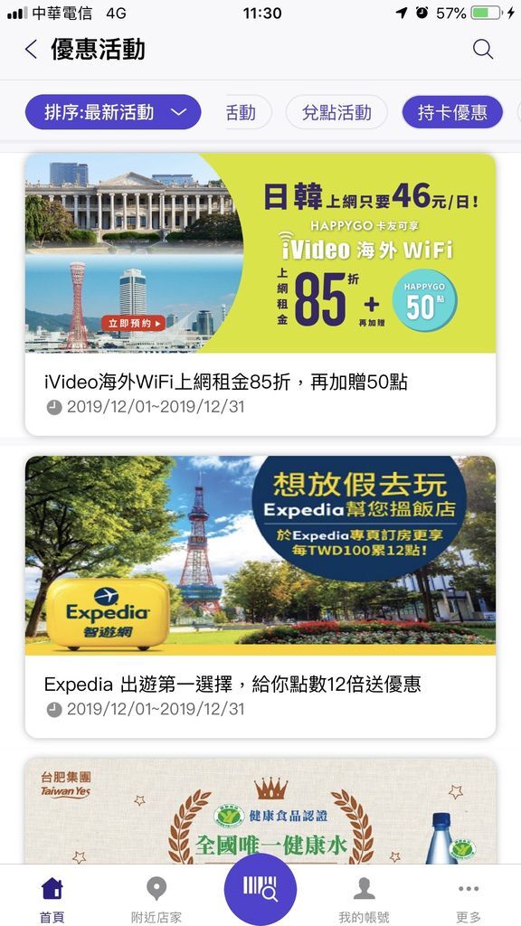進入首頁上方的「優惠活動」,可以一覽HAPPY GO相關的優惠資訊,包括累點活動、兌點活動、持卡優惠、免費得點、主題活動等。