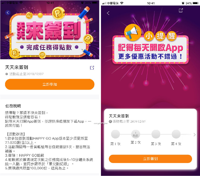 一天只能簽一次,也無法補簽,只要完成簽到天數,就能獲得活動點數,開啟App通知才不會忘記簽到啊,要是忘記一天可會很嘔的。