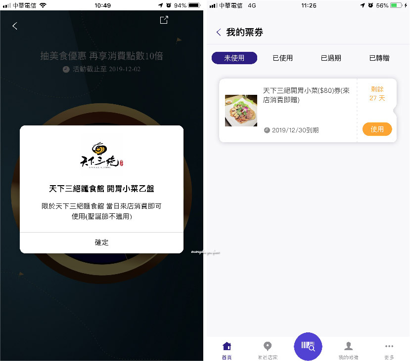 哇~看起來很Lucky喔,馬上抽到一份開胃小菜,抽到的獎項會存放在「我的票券」,可以到這裡來看使用說明及有效期限。