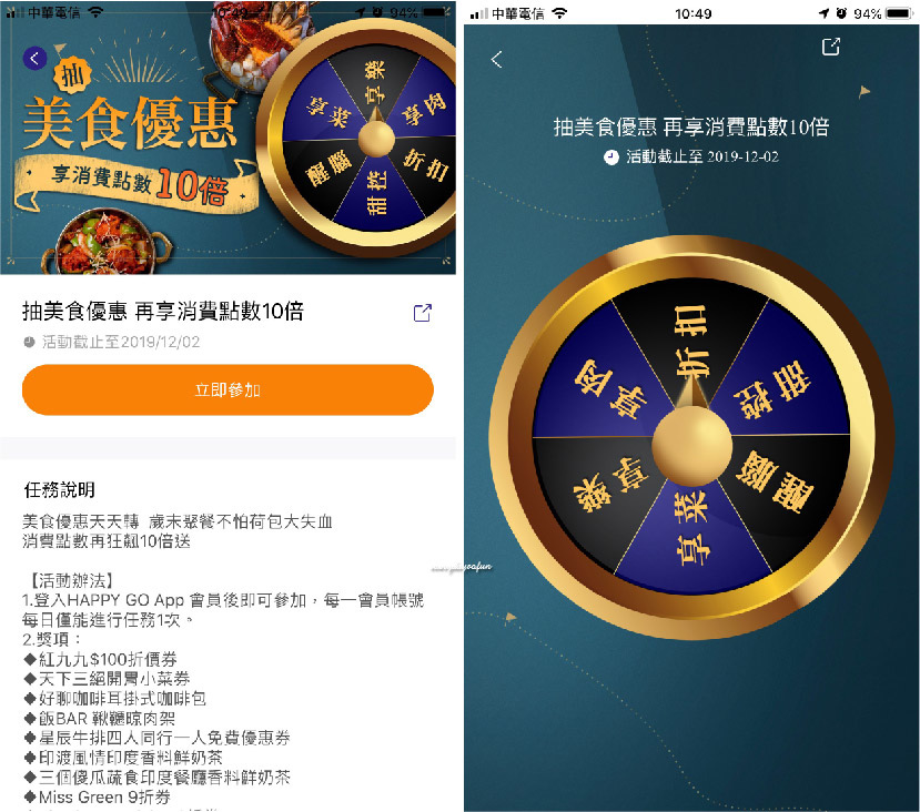 民以食為天,每天都可以來抽一次美食優惠,在下方說明處也有列出獎項細節,有美食折價券、開胃小菜券、咖啡包、飲料…等。