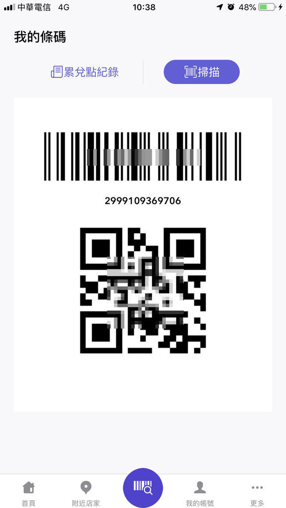讓我們到全家超商實際走一趟,買好早餐於結帳時出示手機,點選畫面正下方的條碼圖案,就會出現自己專屬的累點條碼,提供給店員嗶一下就完成了。