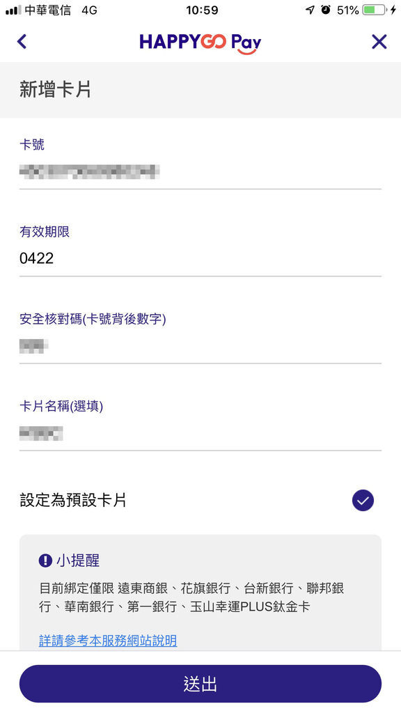 目前可綁定的卡片為:遠東商銀、花旗銀行、台新銀行、聯邦銀行、華南銀行、第一銀行及玉山幸運PLUS鈦金卡。