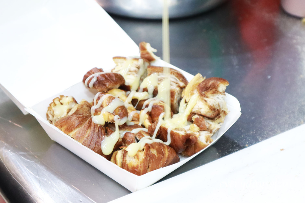 看著剛起鍋的螺絲捲,老闆豪邁的淋上煉乳,哇~濃郁的香氣,當場就想直接大快朵頤啦,家中有小朋友的話,這道非常推薦。
