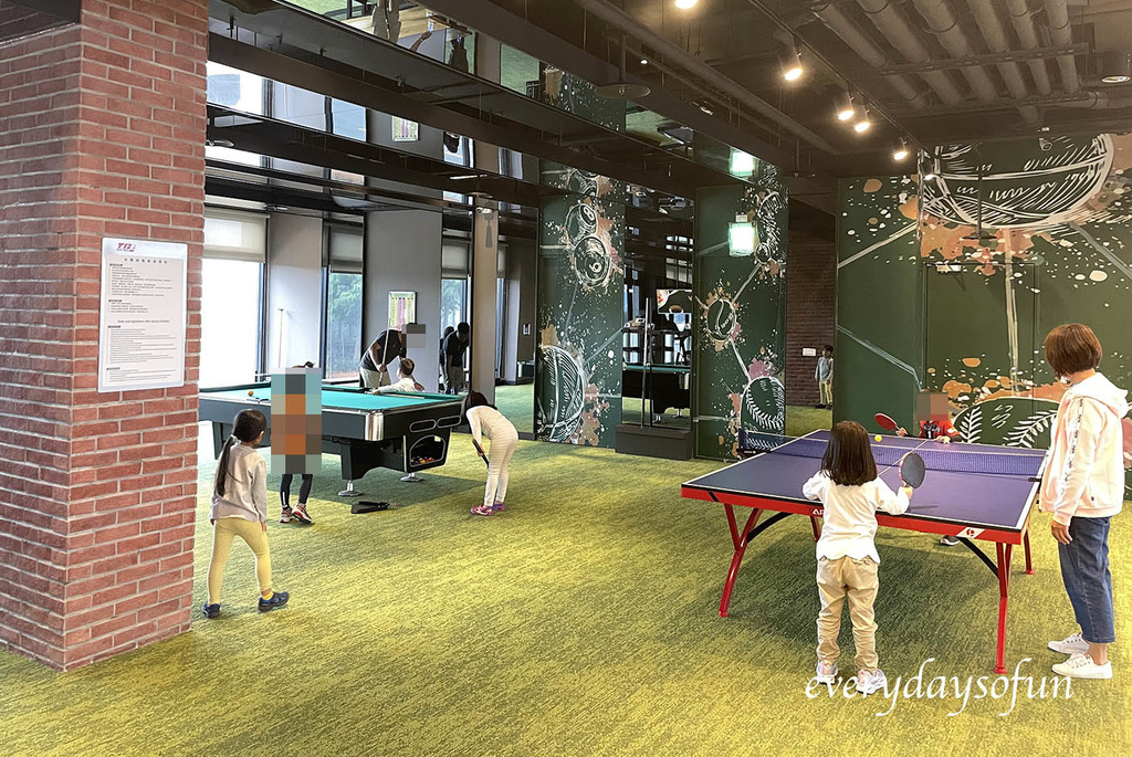 L樓的空間除了大廳之外,還有一個非常棒的交誼空間,早上的自助早餐就是在此用餐,另外有一個運動休閒區24小時開放,這個區塊有少量的健身器材與桌、撞球組,特別一提,1樓也有洗手間,親子這塊做得非常好,讓我帶著小妹子也不會狼狽出場。