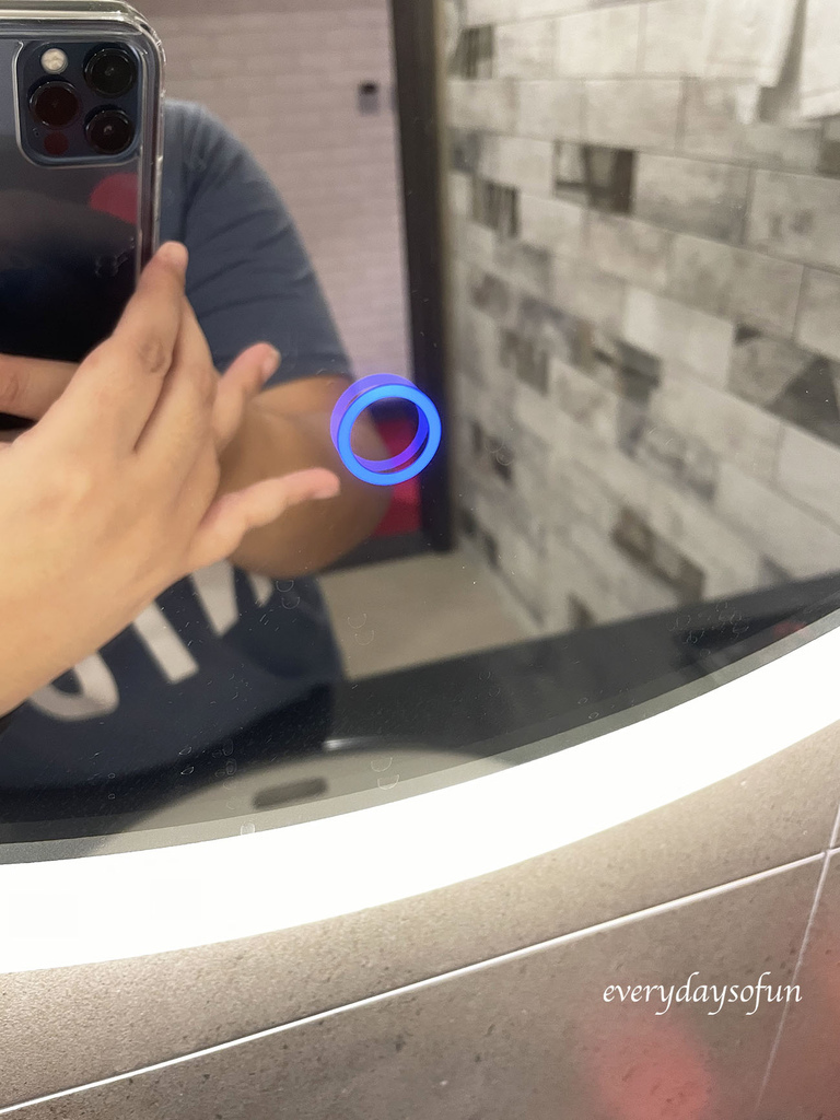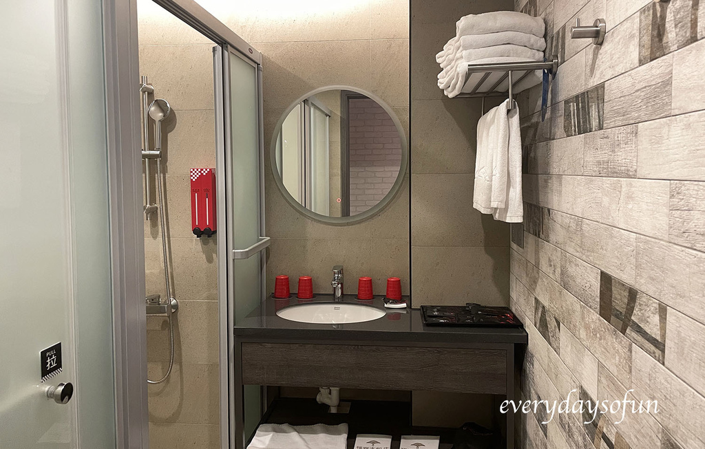 衛浴空間除了沒有浴缸、乾濕分離外,廁所也做了獨立空間,所以就算有人在洗澡,也可以任意使用廁所,只是上方空間是開放式,備品及污衣袋都有提供,鏡子十分現代感,有按鈕可以按。