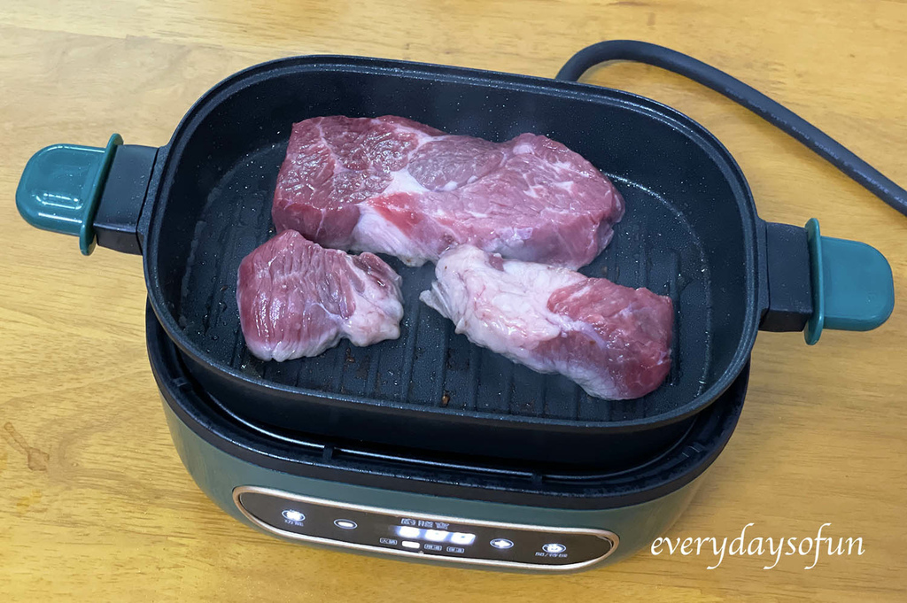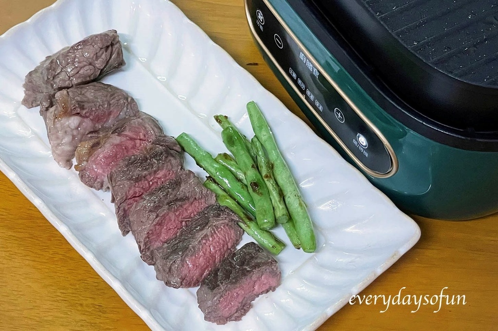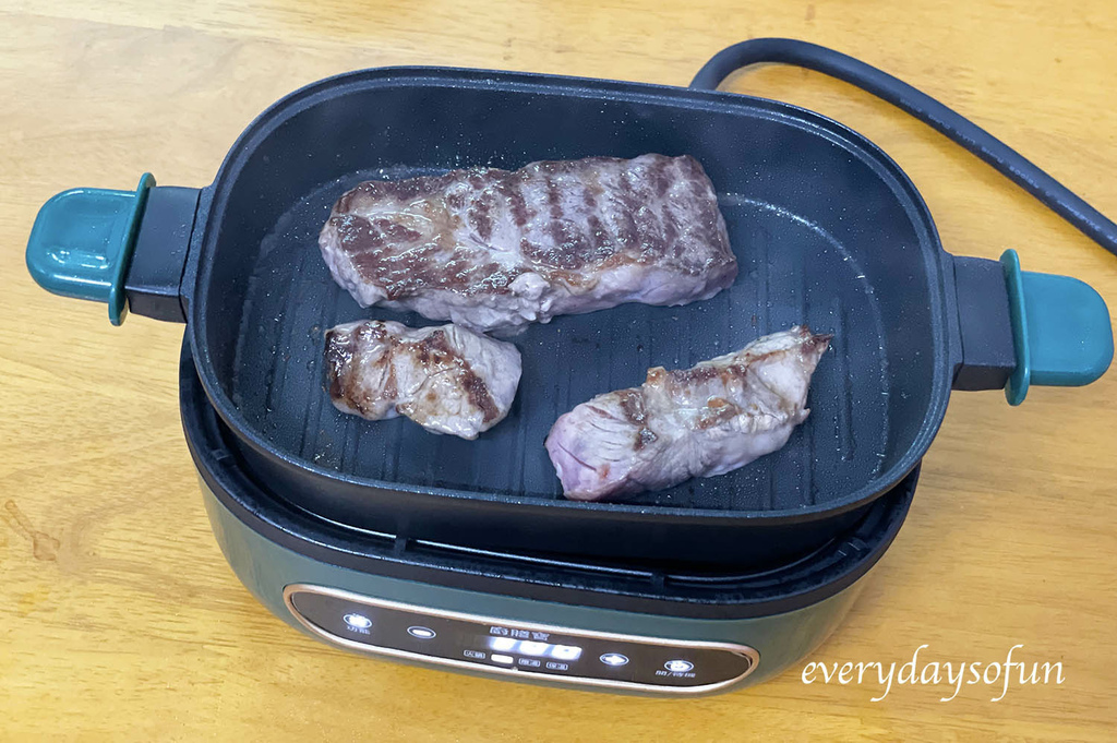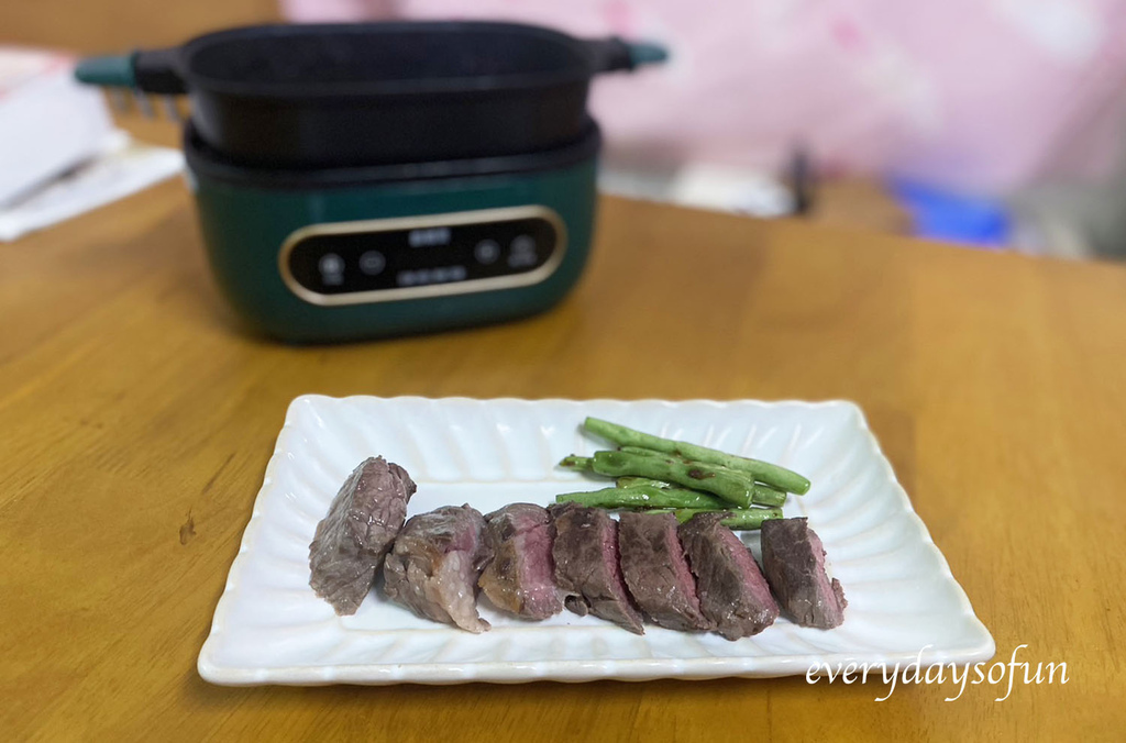 這道讓人食指大動的牛排,我使用的是大煎盤,將功能調至煎炒,此時火力會顯示600,熱鍋後放入牛排,煎至喜歡的熟度即可。