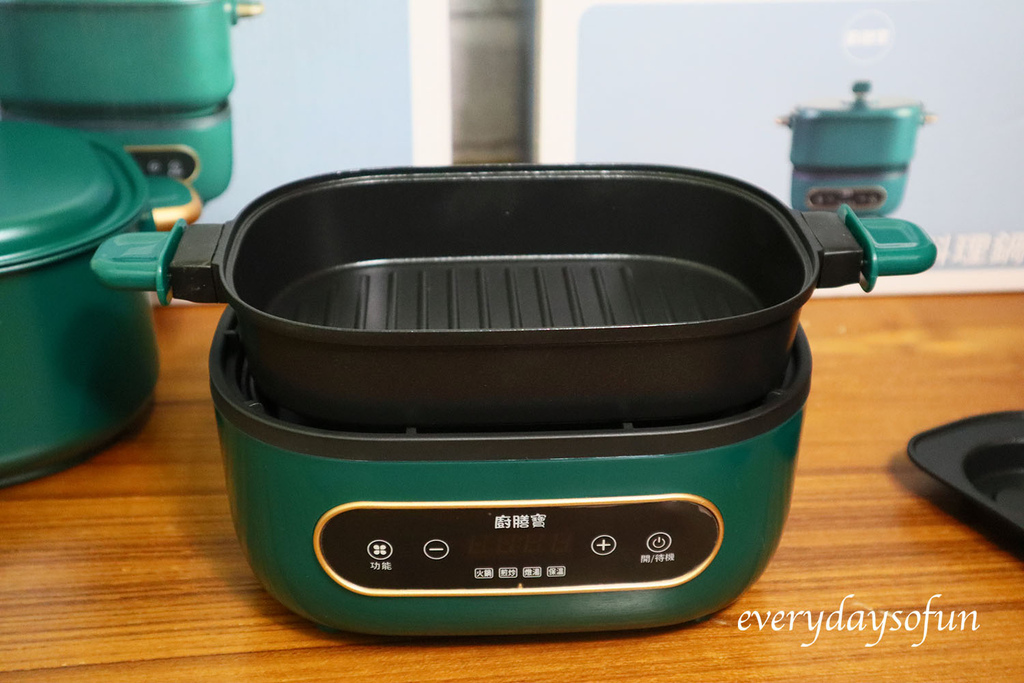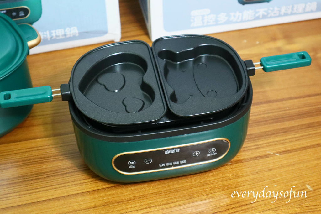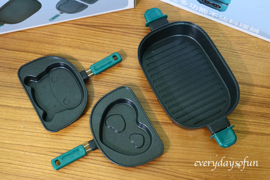 除了主機以外,還附有1.6L的深鍋,適合煮飯、油炸、褒湯、火鍋,以及比較容易噴濺的熱炒料理;輕巧的大煎盤,適合煎烤肉品、海鮮、吐司等等;可愛的造型小煎盤,可以用來烘蛋、鬆餅、雞蛋糕等。