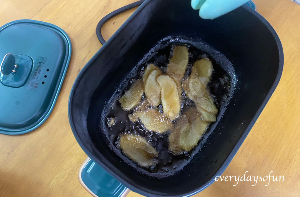 1.6L深煮鍋的尺寸很適合我們一家三口的份量,將功能調至火鍋,此時火力為700,熱鍋後倒入大量麻油,待油熱後再加入薑片拌炒,炒到香味瀰漫就可以放入雞腿塊,沒錯~我們一鍋到底,拌炒與煮湯不需要再換鍋了,這也是料理鍋方便迷人之處。