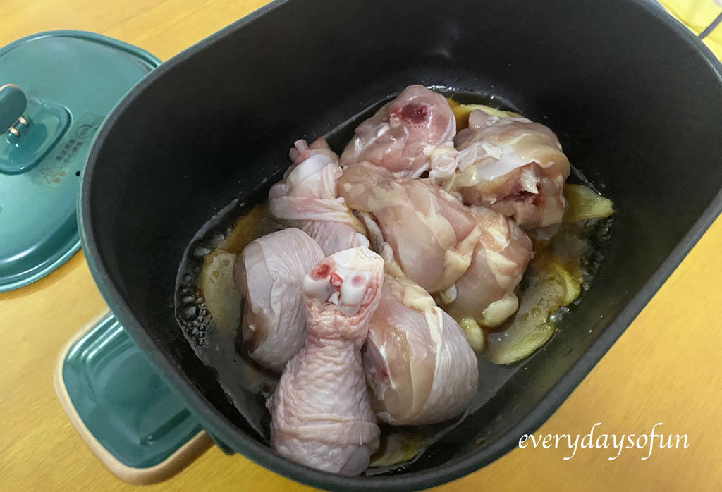 備料:雞腿適量切塊、麻油、米酒、薑片
