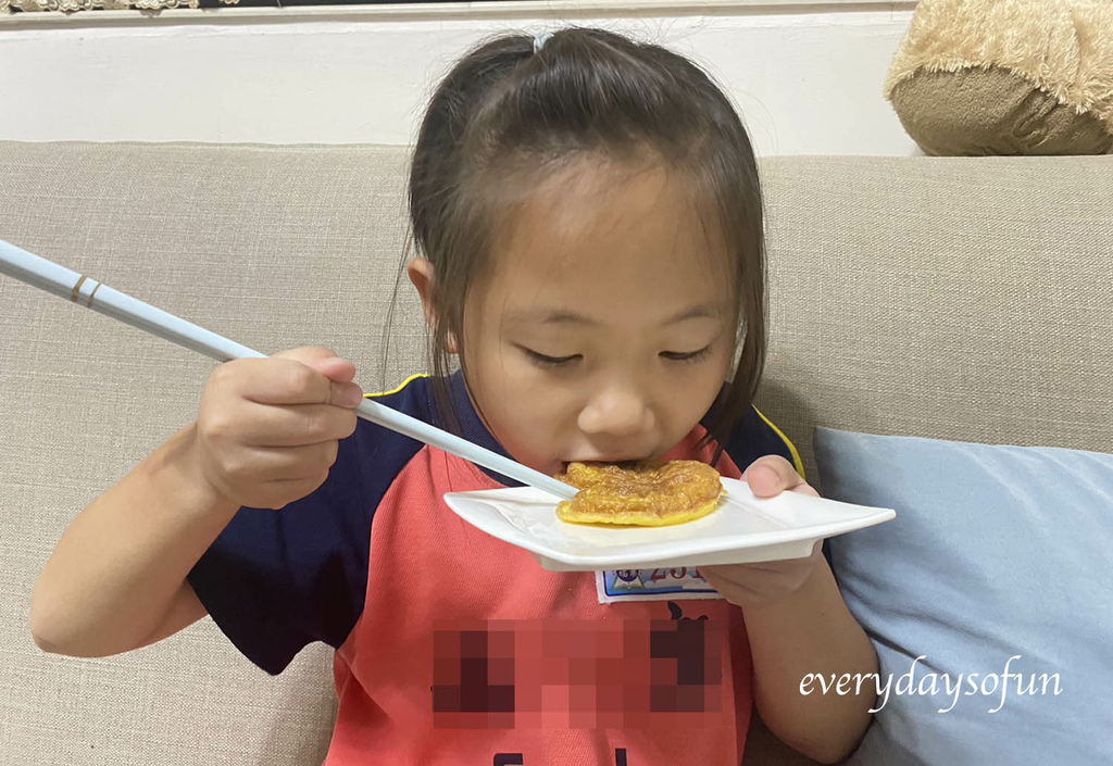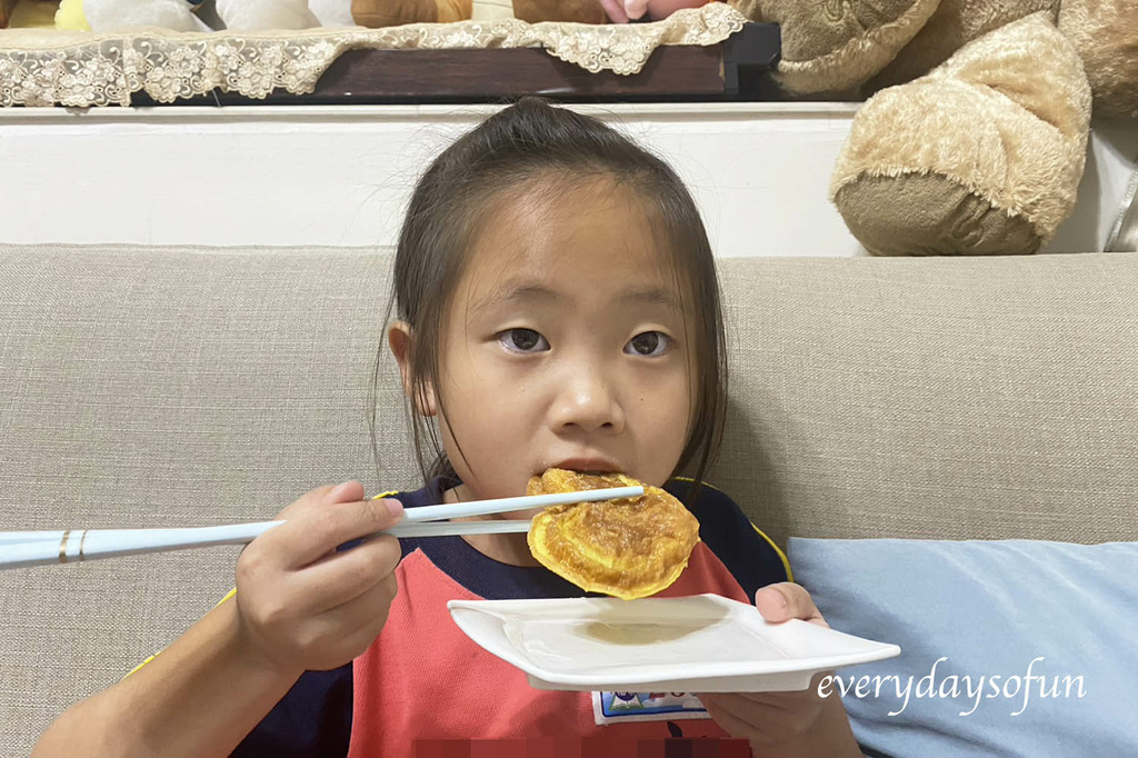 如果喜歡吃鬆軟口感的話,就不要煮太久囉,因為我女兒很喜歡吃焦香感的蛋,所以我有特別放久一點,出鍋也很容易,只要倒扣就輕鬆上菜。