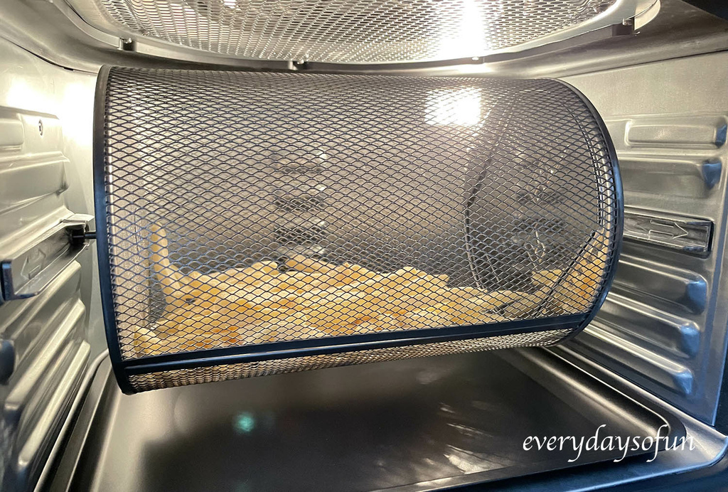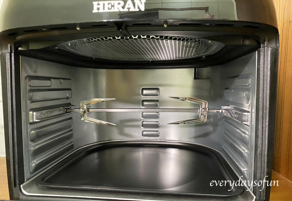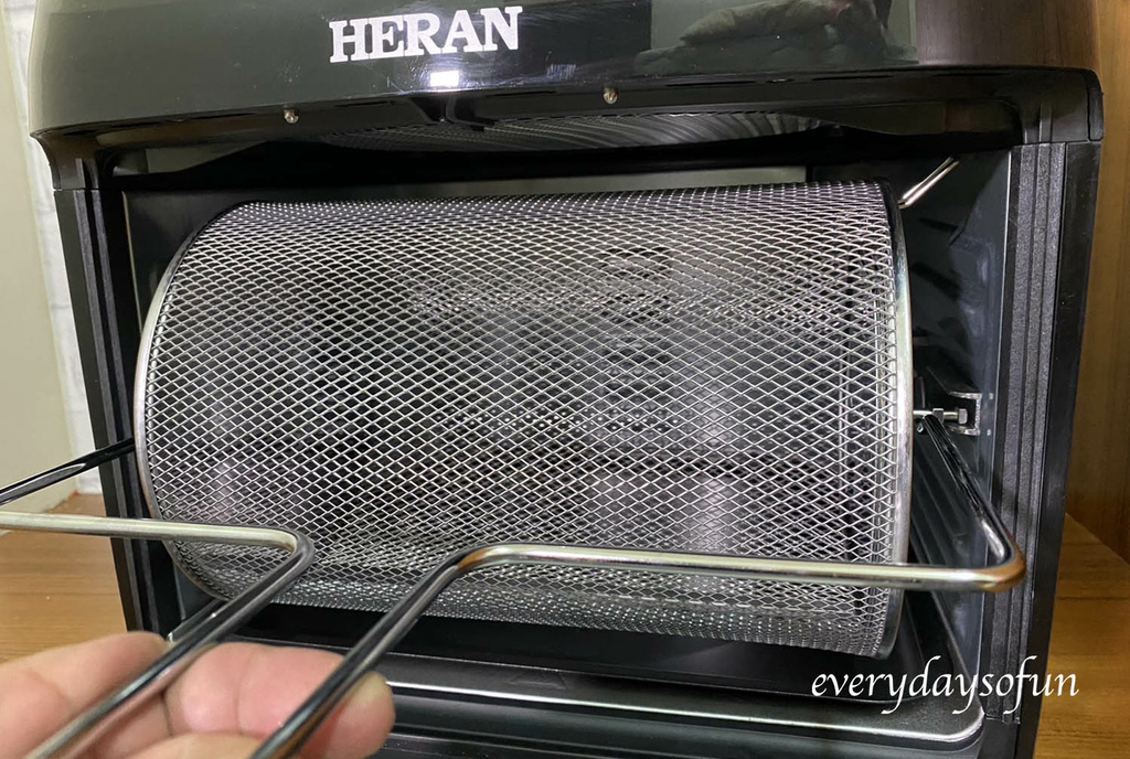 將轉籠放入氣炸烤箱內,內壁滑軌穩固好用,轉叉也是一樣的放入方式,不會像傳統烤箱一般對不準又卡卡的。