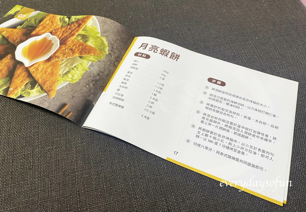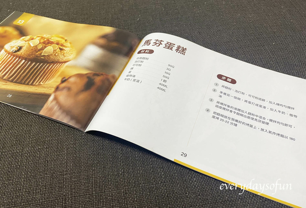 產品本身內建十道自動烹飪菜單,包括薯條、魚、蝦、牛排、雞腿、PIZZA、蛋糕、果乾、麵包、烤雞,只要參考食譜內的料理步驟說明,我們只需準備食材,就能一鍵啟動等上菜,超方便。