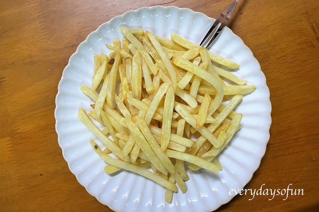 使用面板或APP設定都可以,面板上有薯條圖案的設定,直接按下圖示即可開始180度15分鐘的料理排程,料理完成時機器會發出BBB的聲音提醒,確定面板顯示OFF再開啟,一道香噴噴的炸薯條就輕鬆完成啦!