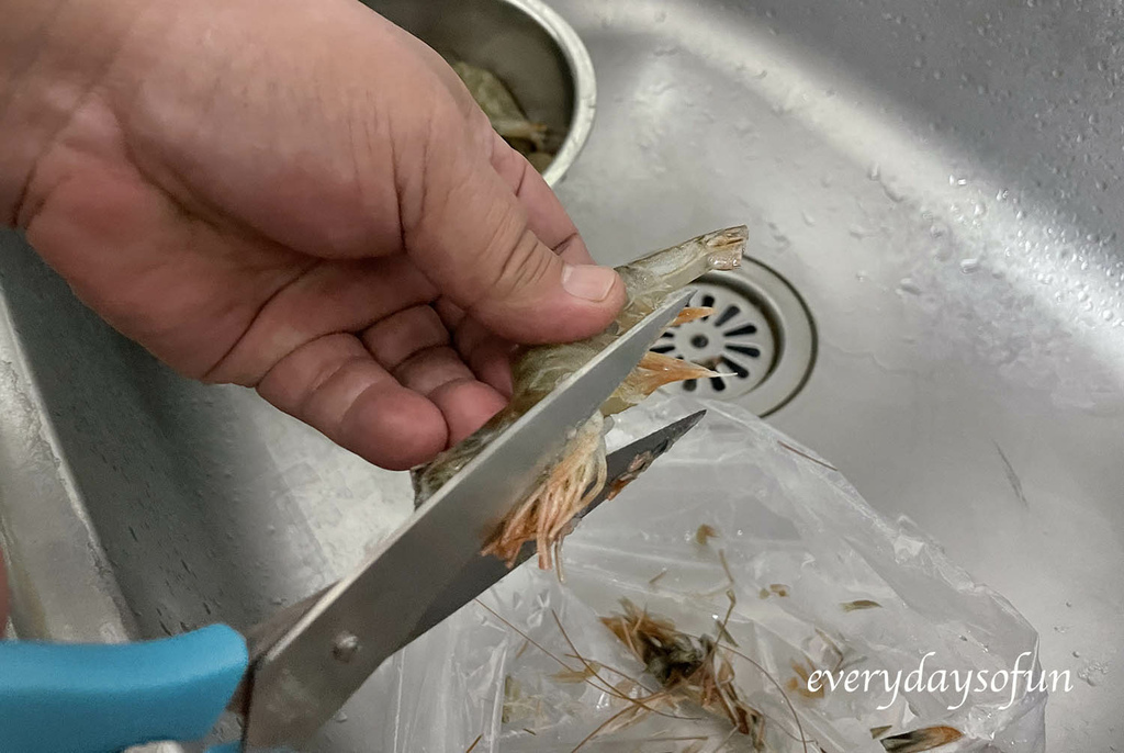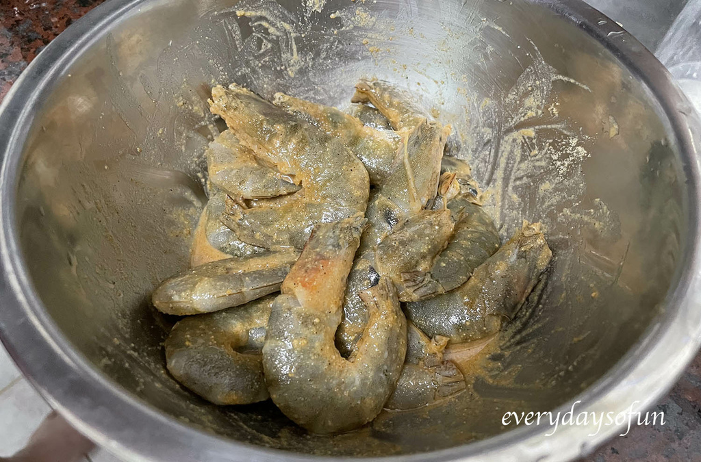 將白蝦洗淨開背去尾處理好,再用米酒去腥抓醃,加入2/3的胡椒調味包,用手抓捏讓蝦子可以均勻沾附。