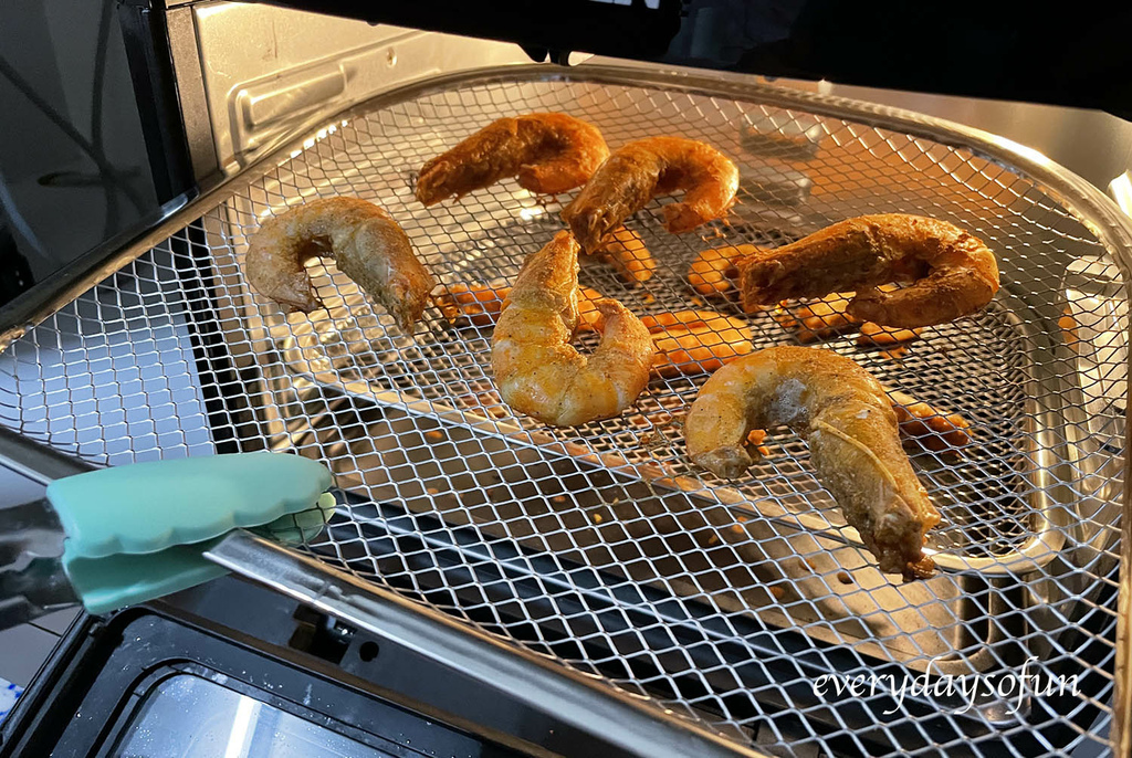 按下面板上蝦子的圖示,會進入160度7分鐘的料理排程,其實料理是一件很有趣的事,可以隨喜好及食材大小多寡,適度調整溫度及時間,完成後將蝦子取出,再倒入剩下的調味粉拌勻即可上菜。