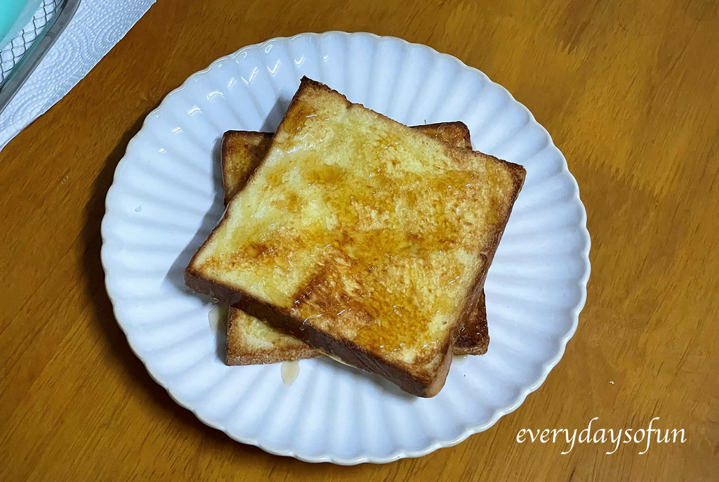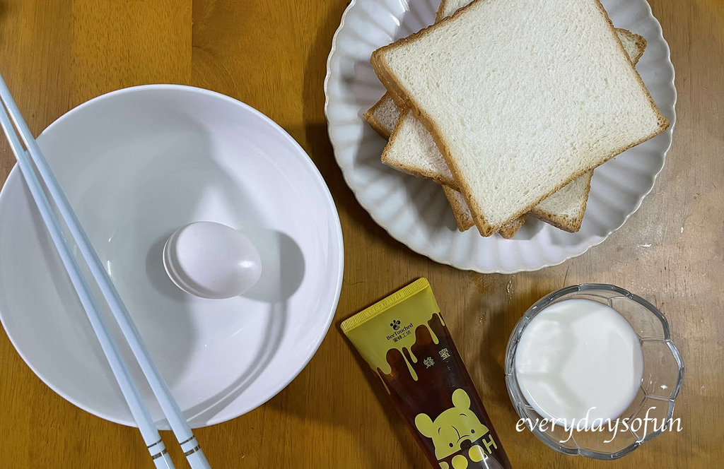 備料:吐司2片、蛋1顆、牛奶15ml、楓糖或蜂蜜少許