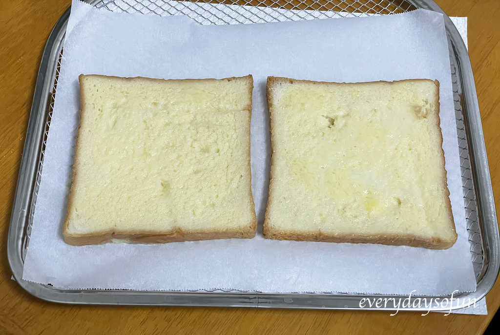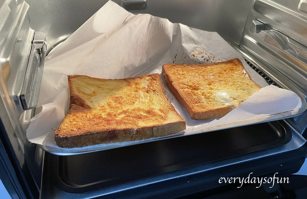 如果不喜歡湯湯水水滴落,可以在不鏽鋼烤盤上鋪張料理烘焙紙,而且要記得紙比盤小才安全,吐司放在烤盤上再推入烤箱,烤箱需事先預熱180度3分鐘。