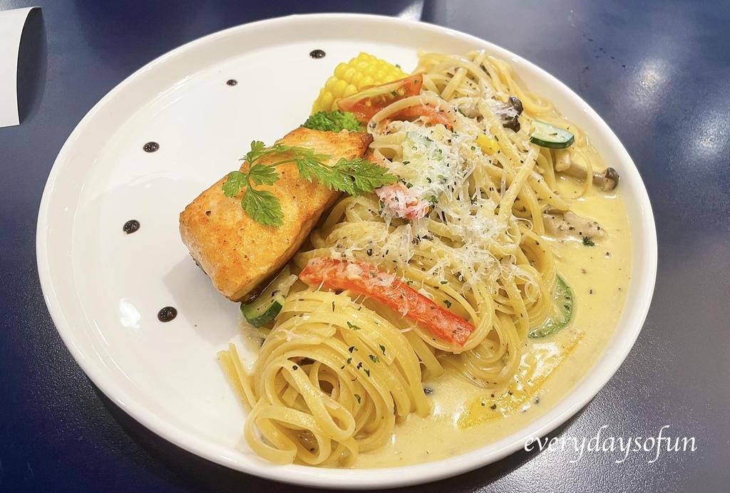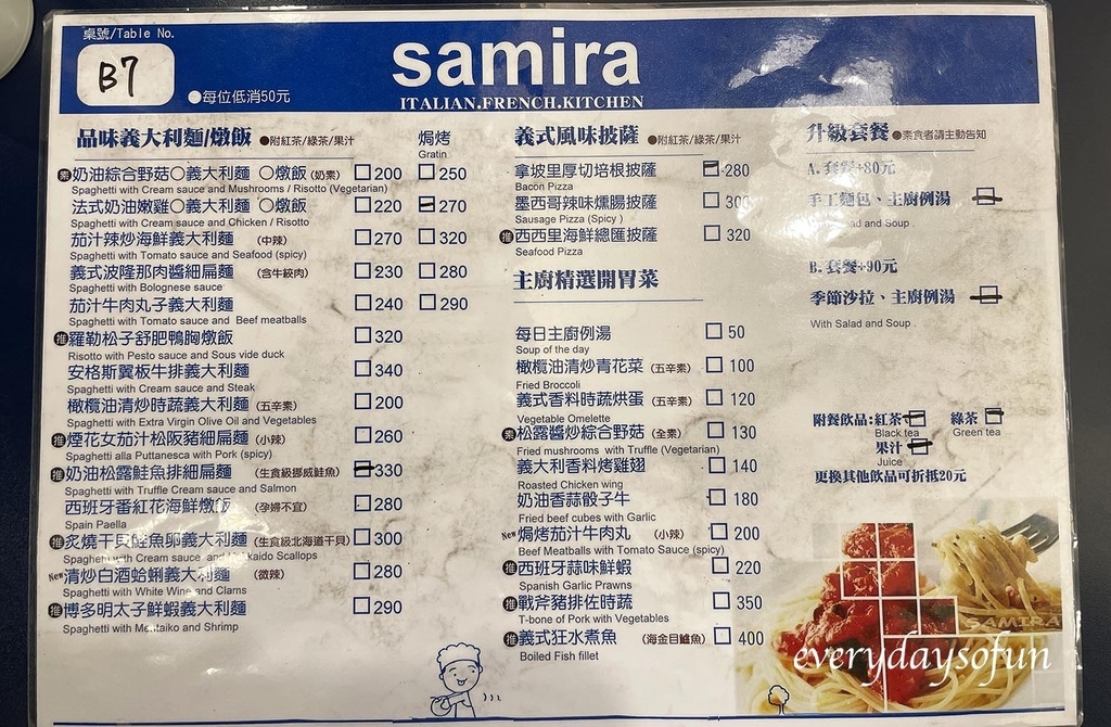 義大利麵、pizza、燉飯、開胃菜與飲品,口味選擇雖不是非常多,但也算多元化,牛豬雞鴨海鮮都囊括在內,基本低消$50,除了開胃菜外,其他餐點都有附飲料:紅茶、綠茶、果汁三選一,也可加$80升級A套餐,會多麵包跟湯;加$90的B套餐則是多沙拉跟湯。