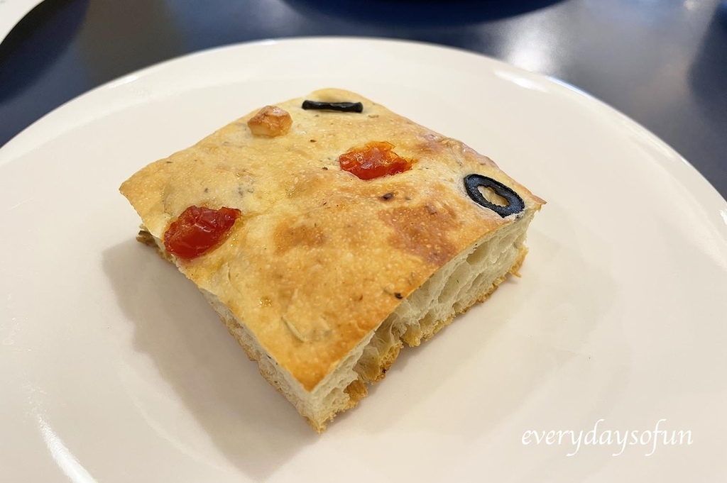 套餐麵包每天未必同款,今天這個應該是佛卡夏吧,Zia沒吃過佛卡夏,一開始看到外觀直接拒絕,但我咬了一口發現這滋味簡直太美妙,哄Zia吃了一口就拿不回來了,口感鬆軟,在嘴裡咀嚼時不斷散發出清新香氣,最外層卻又帶點酥脆,這麵包我給大姆指。