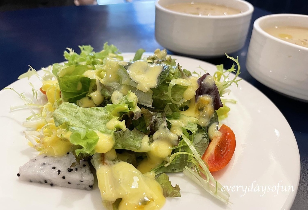 新鮮的蔬菜及水果,淋上特製的蜂蜜芥末醬,淡淡的酸甜味道,讓蔬果吃起來味道層次更豐富,可以吃得出新鮮,份量不會太多,餐前這樣剛剛好。