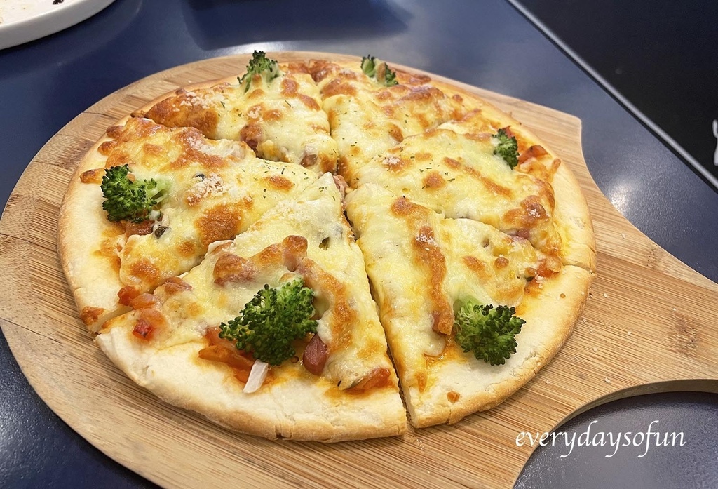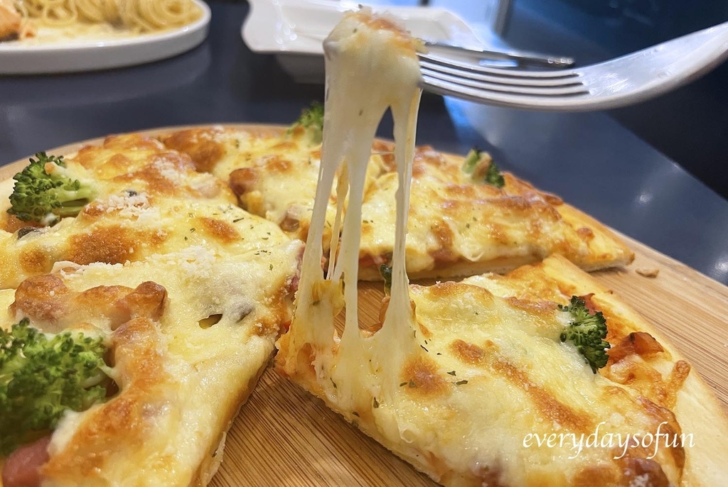 很豪氣的滿滿起司,焗烤後的香氣真是無人能敵啊,我跟Zia都是衝著這一大片點的,奶氣十足,細麵條裹上奶醬咻的入嘴,超滿足,嫩雞肉大小不一,有些是小塊狀,有些是細條狀,份量普通,跟小孩分食這一份會吃不飽,所以我們有再多點pizza。