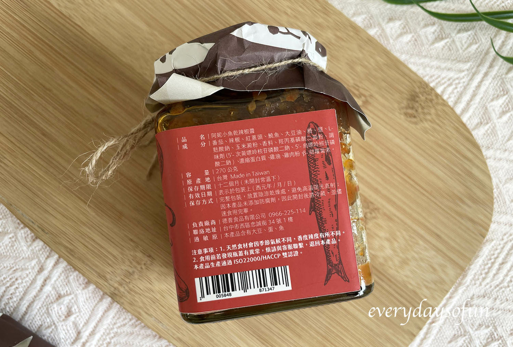 真材實料的阿妮,裡面有許多營養豐富的小魚乾,而且小魚乾都是整尾而非支離破碎的,小魚乾高鈣清甜,辣椒醬整體除了辣之外,還能吃到小魚乾微微鮮香的味道。