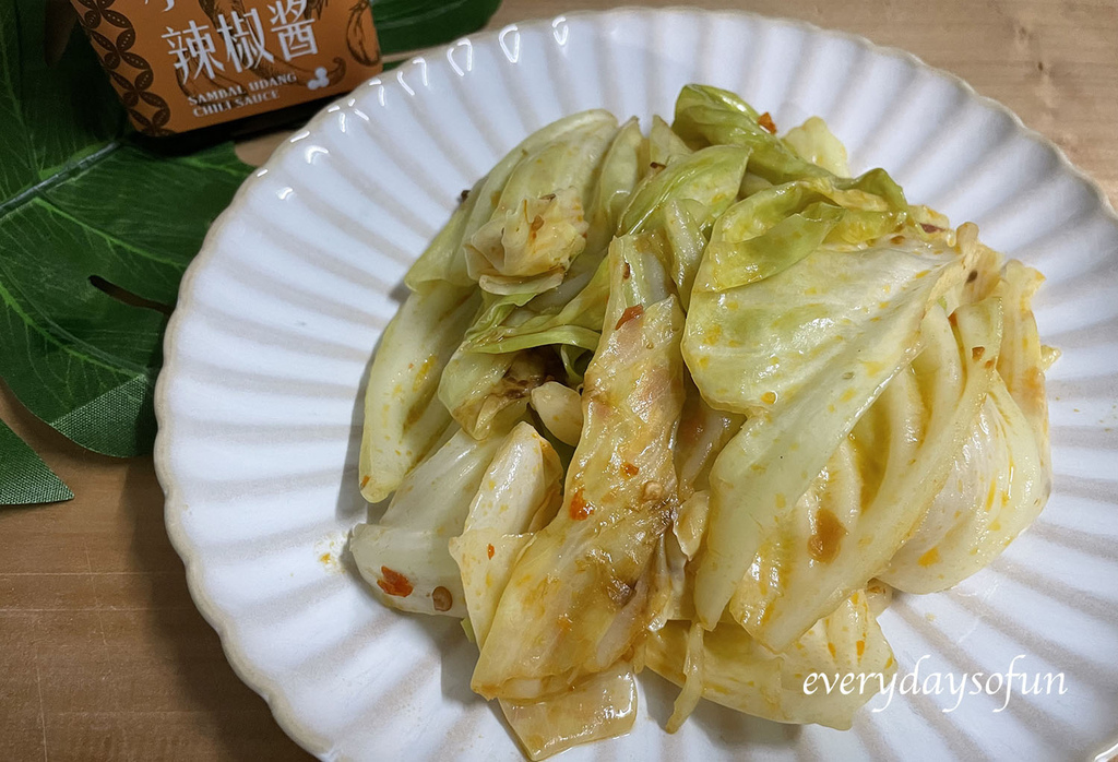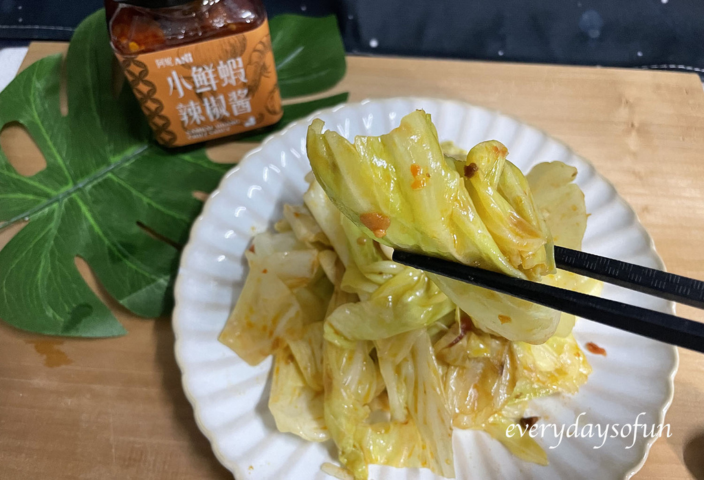 小鮮蝦辣椒醬很適合入菜,尤其是炒青菜的時候搭配,可以讓味道單一的青菜味道更可口鮮美,因為辣椒醬本身有帶點鹹味,所以我炒高麗菜只放蒜頭跟阿妮,就超好吃了!
