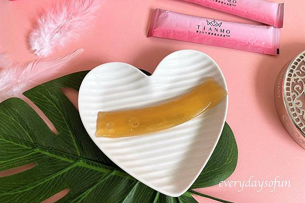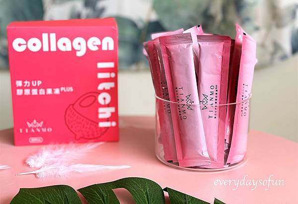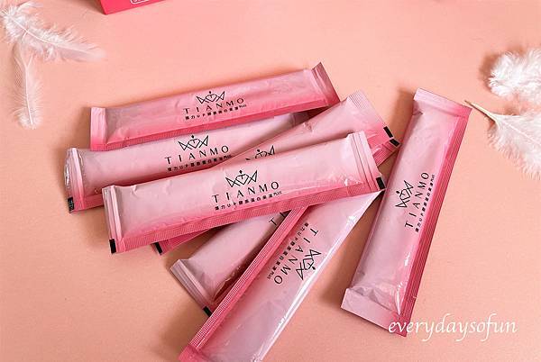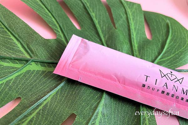 膠原蛋白果凍PLUS一盒內有30包,每一包約20公克,Tianmo膠原蛋白果凍共有八種專利成份,不只彈力與維他命C,保濕、抗氧化也一起補充,採三階段方式補充所需能量。