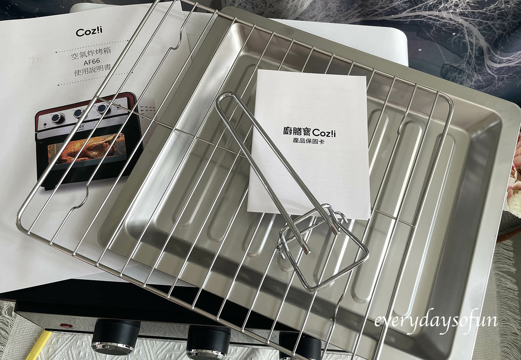 Coz!i廚膳寶氣炸烤箱AF66的外觀我很喜歡,簡約復古的風格,跟我們家廚房白色很搭,開箱後除了氣炸烤箱主體外,還有附上炸籃、烤網、烤盤、烤盤夾及說明書、保固卡。