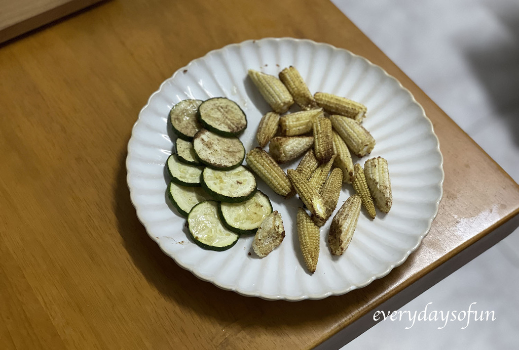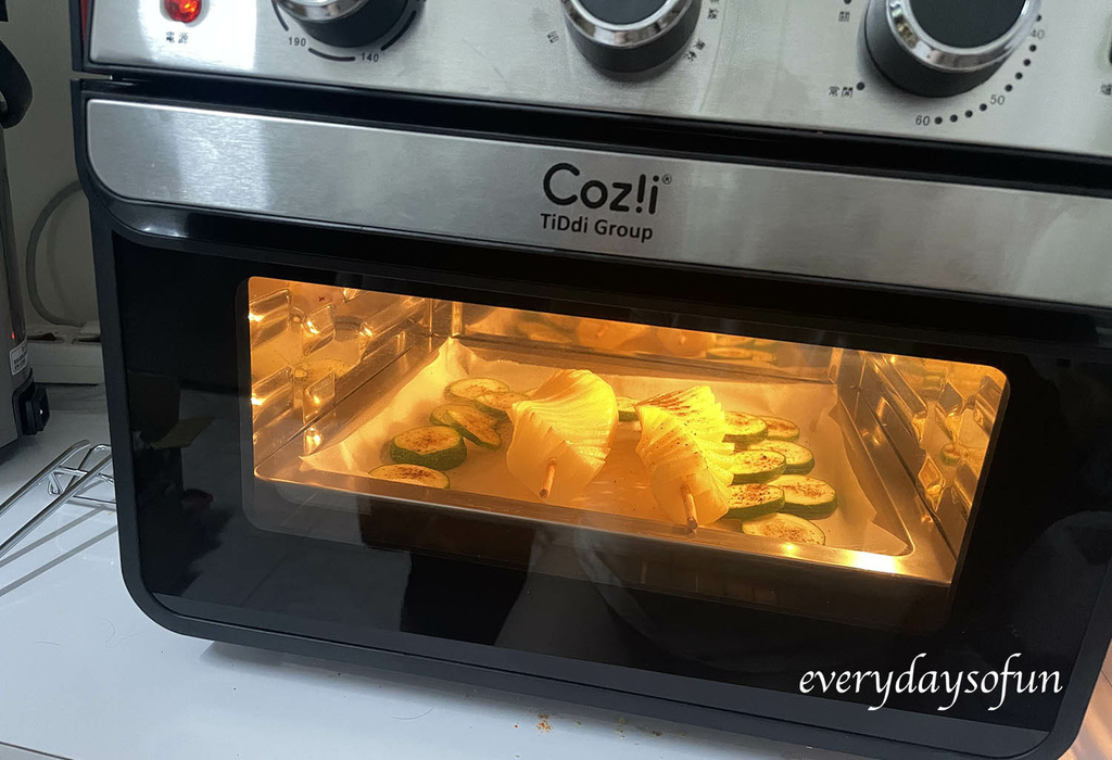 ✔炙燒模式:櫛瓜190度13分鐘、玉米筍需多2-4分鐘