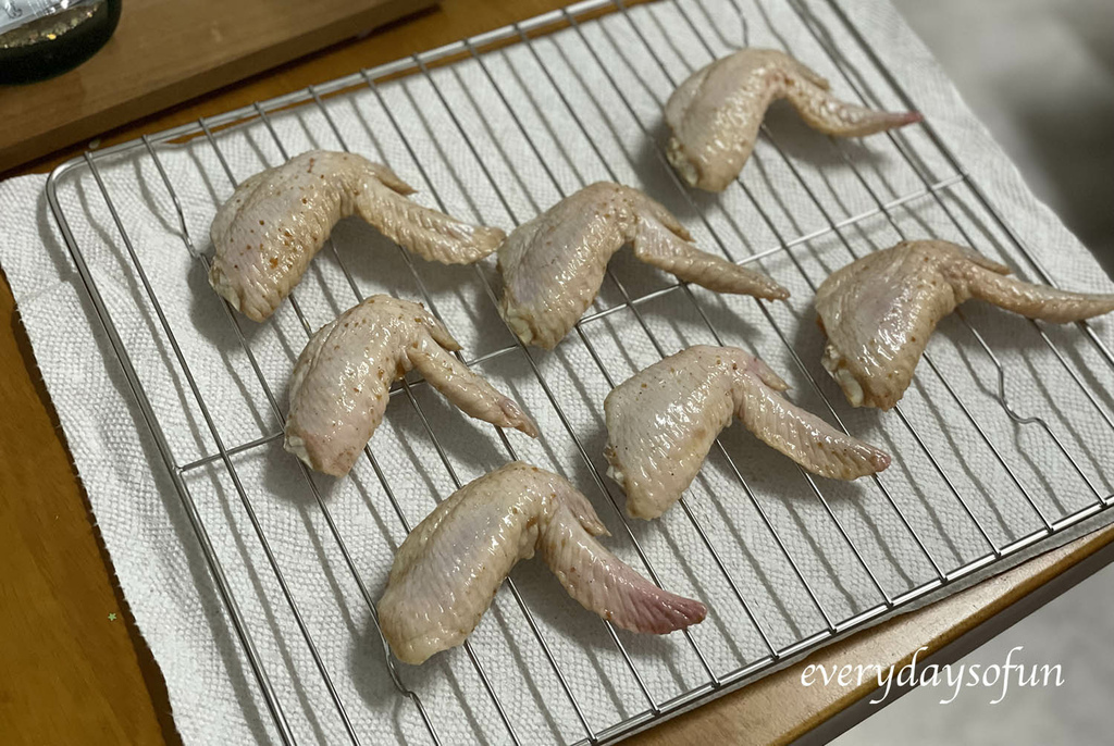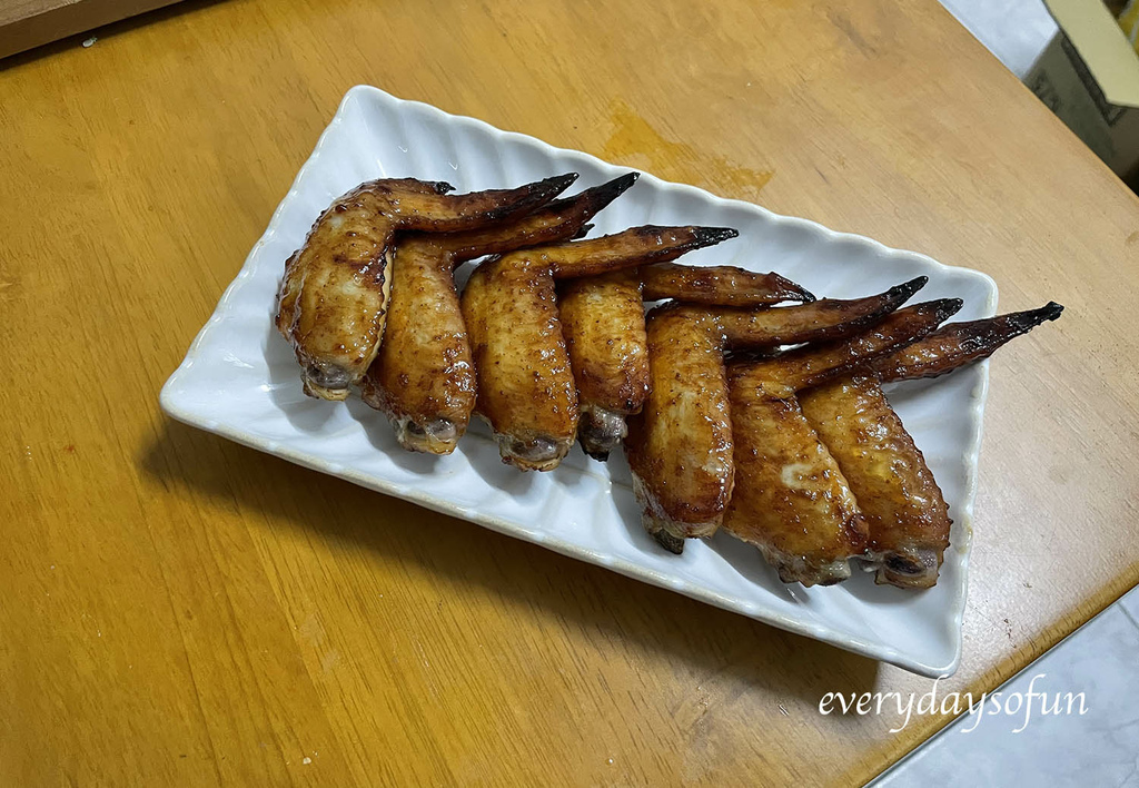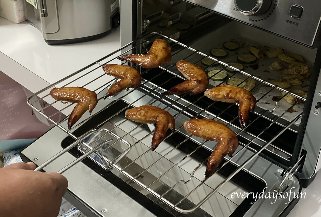 雞翅前一晚先醃好,用米酒、烤肉醬與少許水即可,可以視個人喜好調整濃淡,因為怕醃太鹹,所以就沒有將雞翅先劃刀,醃好直接擺上烤架即可。