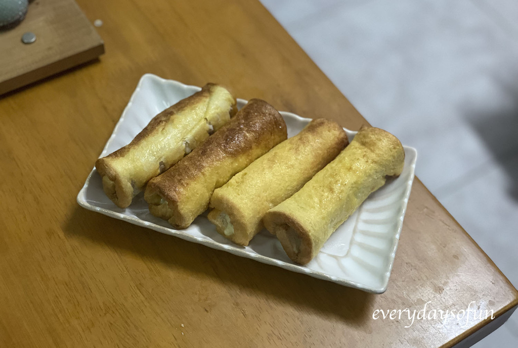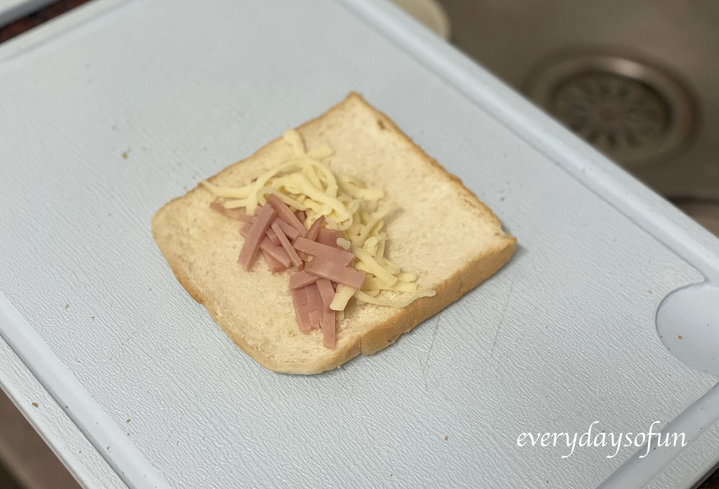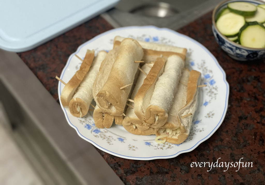 接下來將火腿及起絲適量放上吐司的中間,扎實的捲起吐司,再使用牙籤或竹籤固定,這裡需要注意的是要固定好,不要太鬆散,以及牙籤的長度,不然在烹調的過程中若散開了,賣相就不太好看。