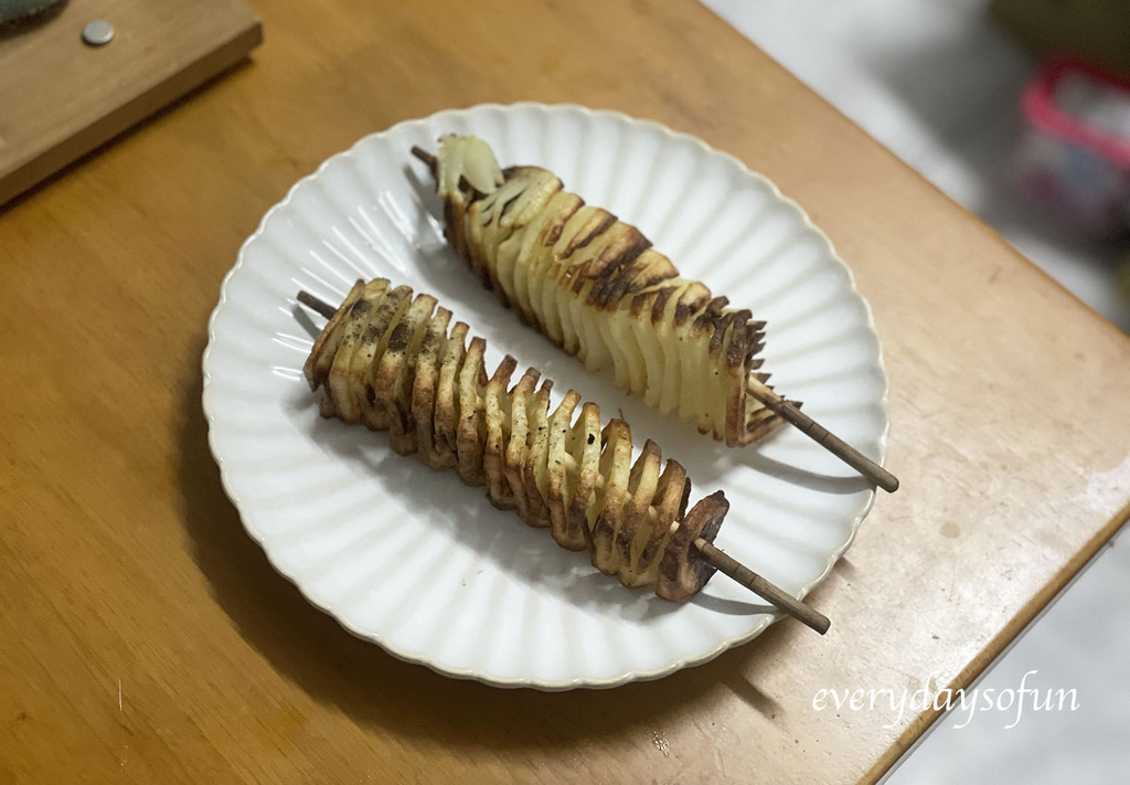 接著插入長竹簽,邊插邊推動馬鈴薯,調整好位置就會展開成串,喜歡吃原味可以什麼都不加,也可以灑上一些鹽或黑胡椒簡單調味即可。