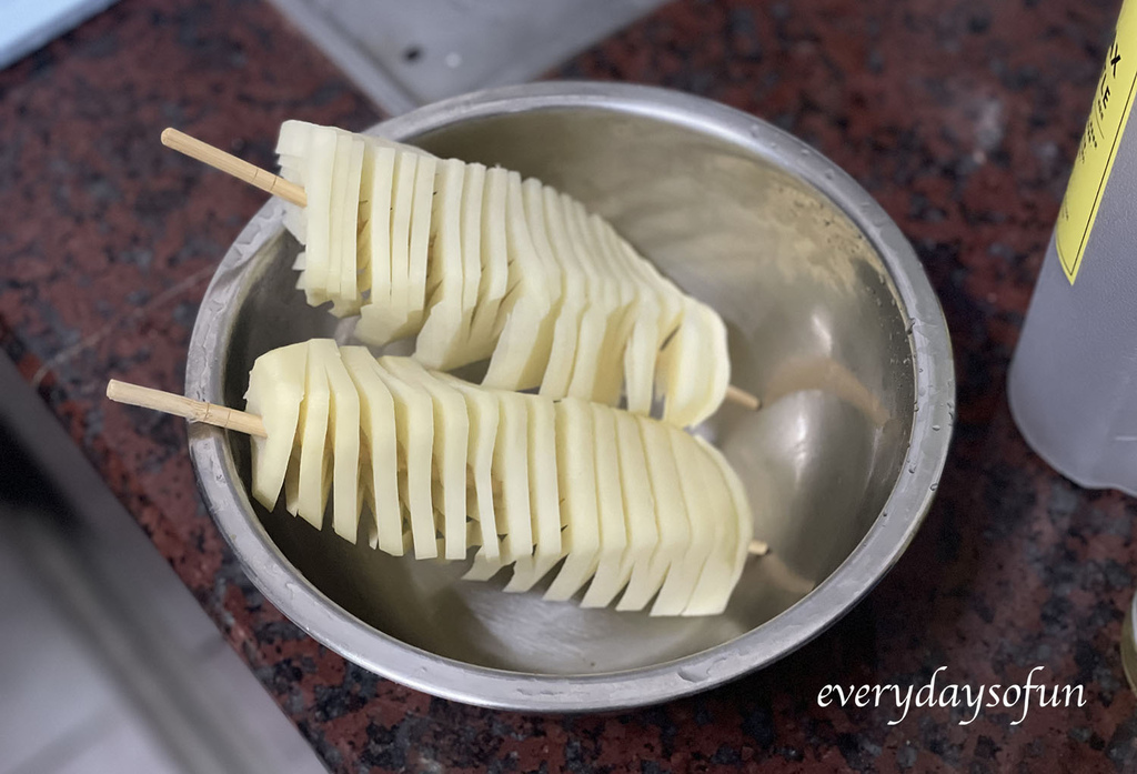將筷子置於馬鈴薯兩側,開始切片但不切斷,落刀時切到筷子處即停止,這樣就不會切斷了,一點也不難喔~切好後要翻面再切一次,才能成串。
