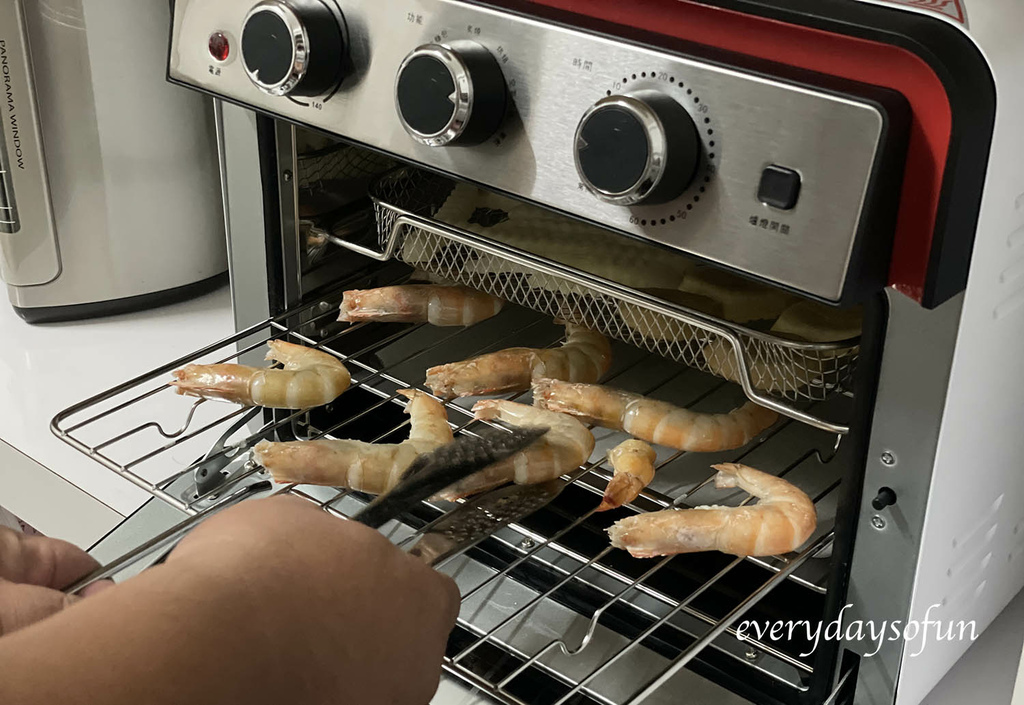 觀察蝦子變色後,取出翻面再繼續,待整隻變色就熟啦!