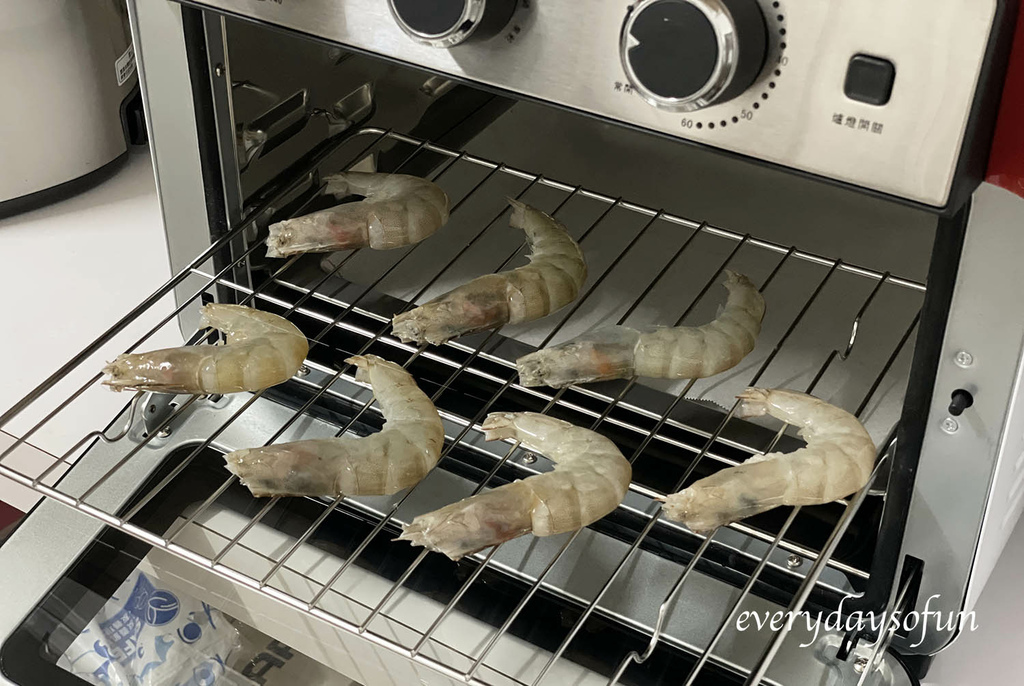 蝦子先經過簡單處理,將討厭的鬚鬚都去除,灑上鹽巴攪拌均勻,就能放入烤箱,實在是超簡單不過了。