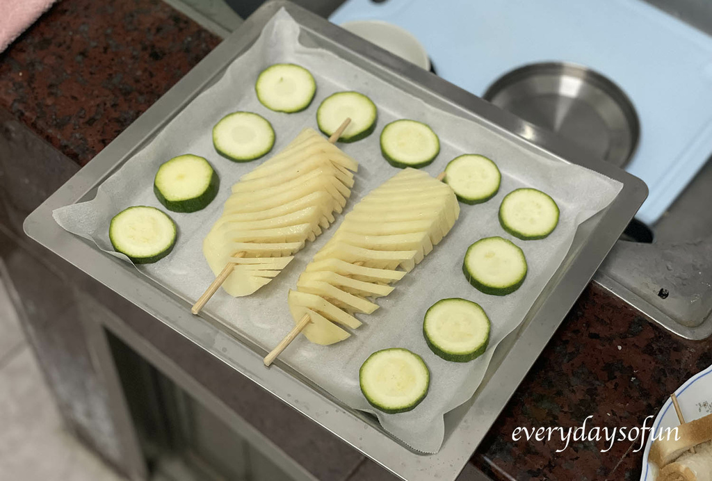 這道料理在我們家很受歡迎,材料與製作過程都相當簡單,若是家中有小朋友的話,更是推薦可以列入早餐或點心名單,簡單處理完食材後,放入氣炸烤箱,就可以去叫小朋友起床換衣服,時間剛剛好!