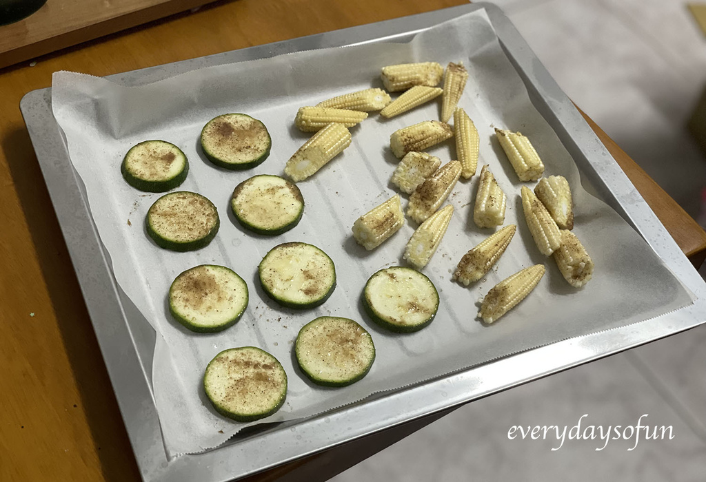 兩種食材都不需特別翻面,玉米筍若喜歡吃軟一些可以先進烤箱烹調,約3分鐘後再加入櫛瓜,美味又健康。